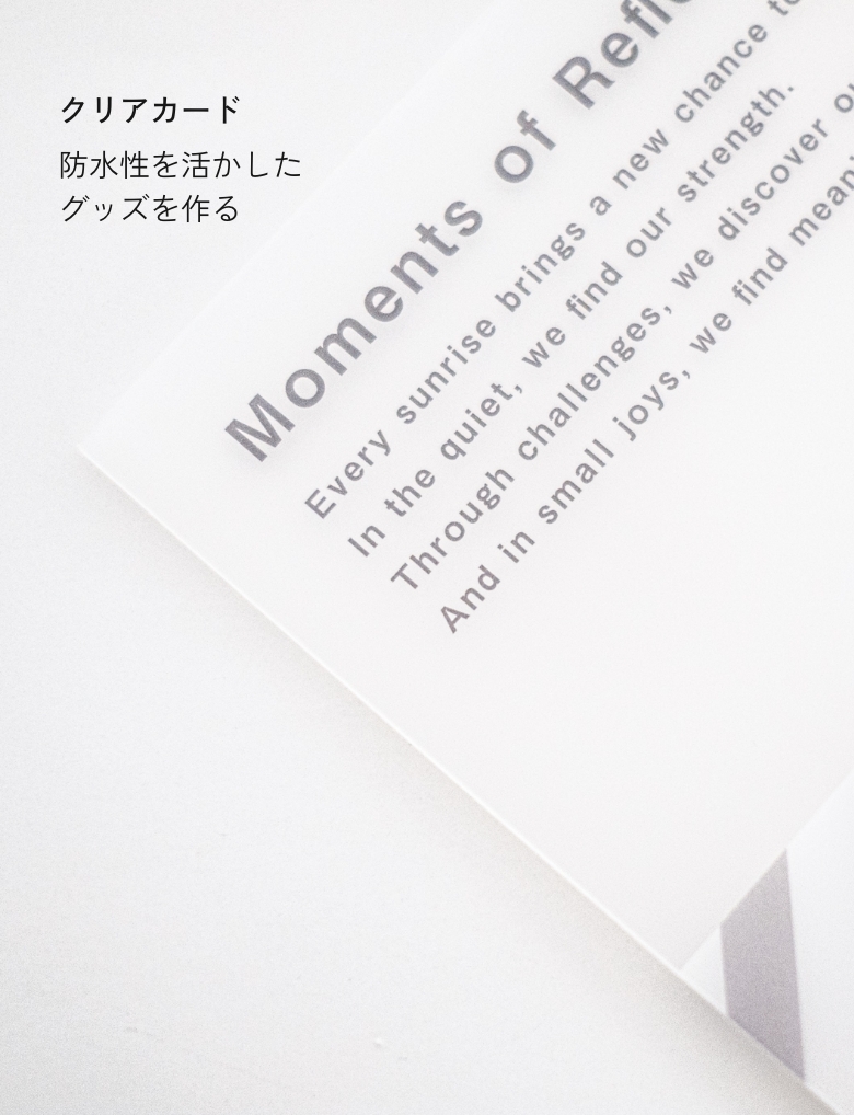 しっかりとした厚みかつ品の良い手触りで、他にはないデザインのクリアファイルを制作することができます。
