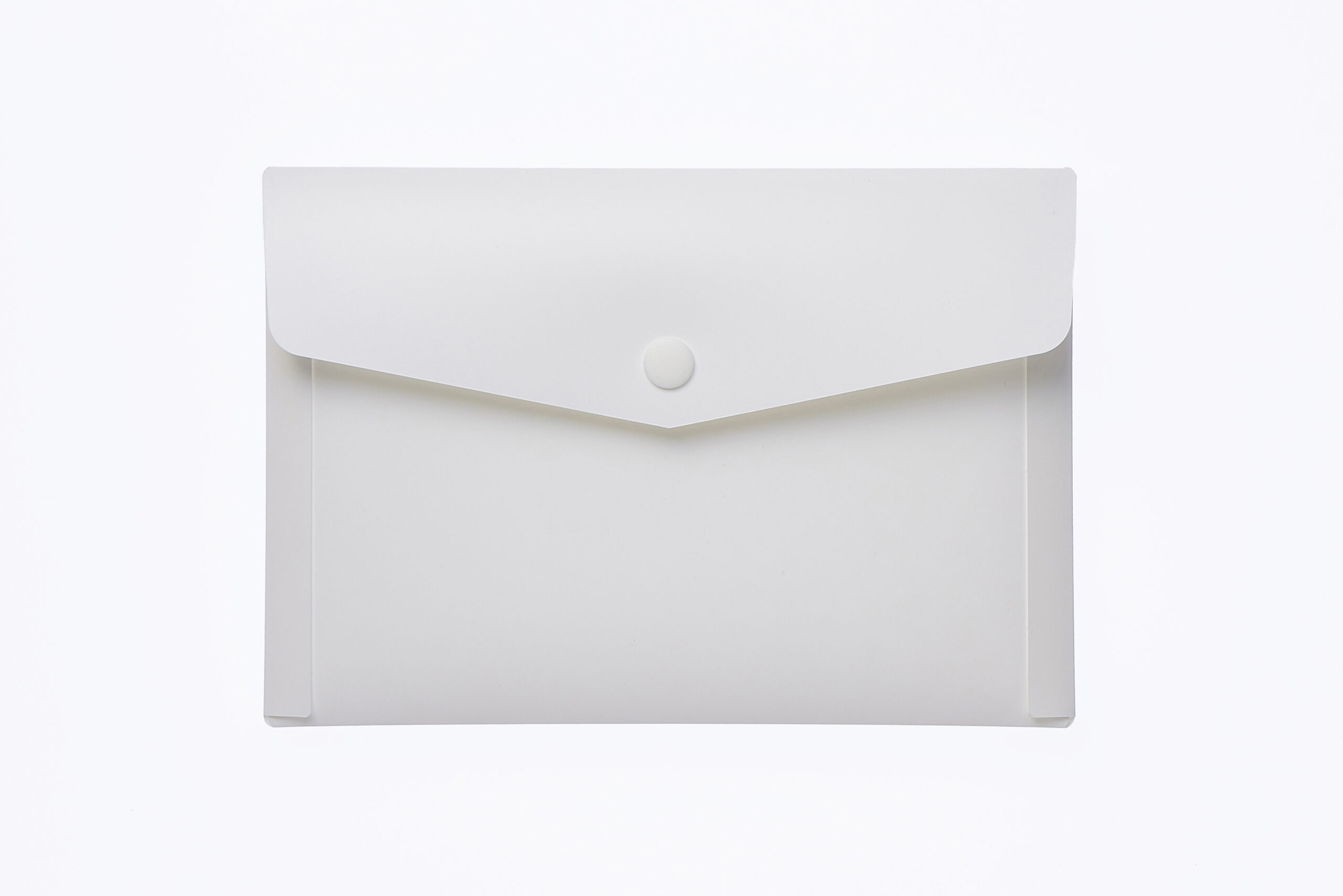 ・封筒(エンベロープ)型で、フラップとボタンにより開閉できるフラットなデザインです。