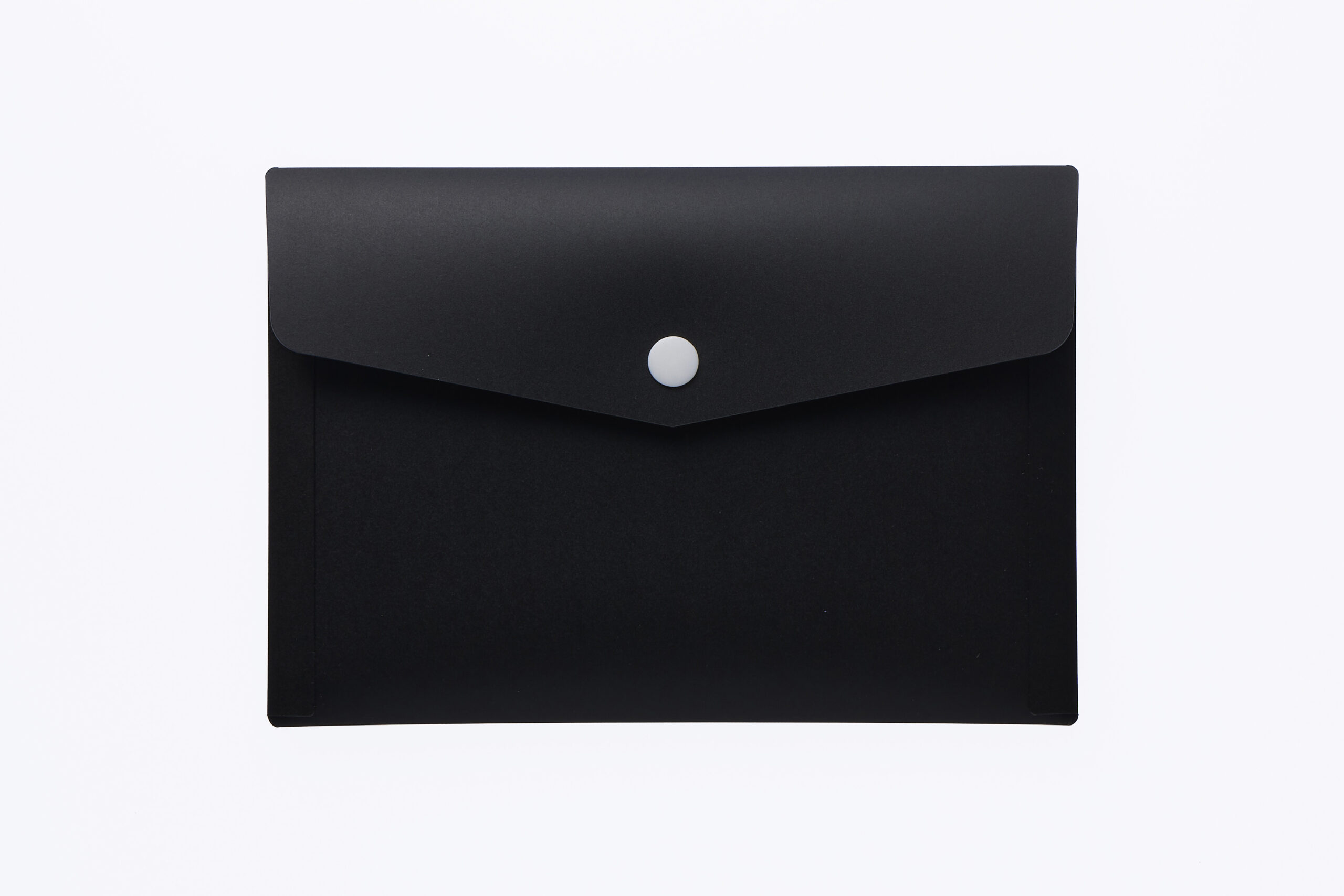・封筒(エンベロープ)型で、フラップとボタンにより開閉できるフラットなデザインです。
